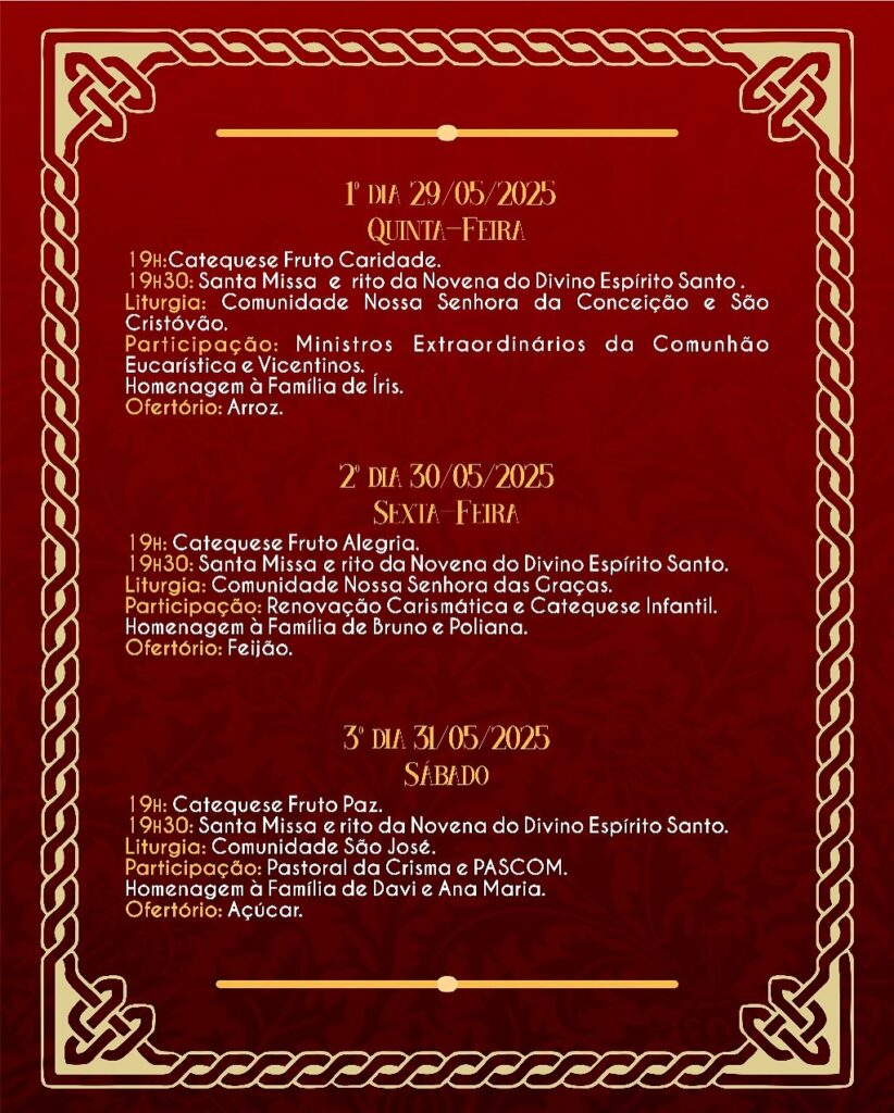 Acompanhe, a seguir, a programação e participe com sua família das Novenas, Oração do Terço, Adoração do Santíssimo, Vigílias, Tríduo e Celebrações Eucarísticas na sua comunidade de fé!