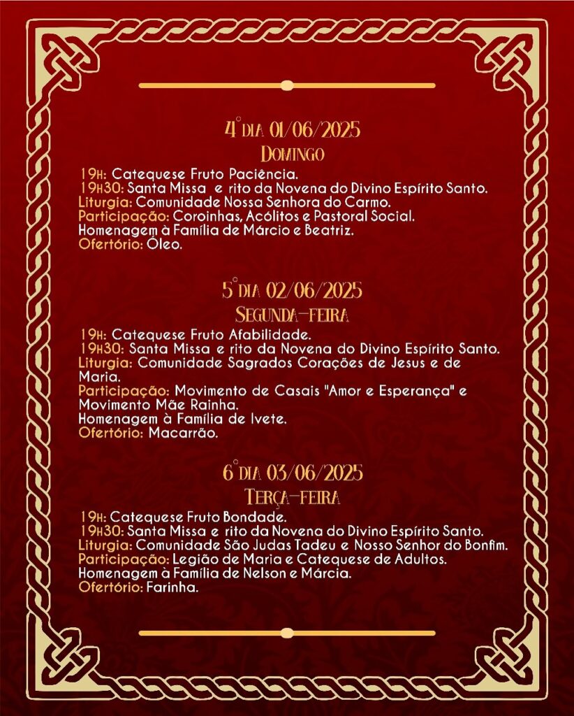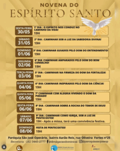 • 18h – Santa Missa: “Os Sete Dons: Sabedoria, Entendimento, Conselho, Fortaleza, Ciência, Piedade e Temor de Deus.”